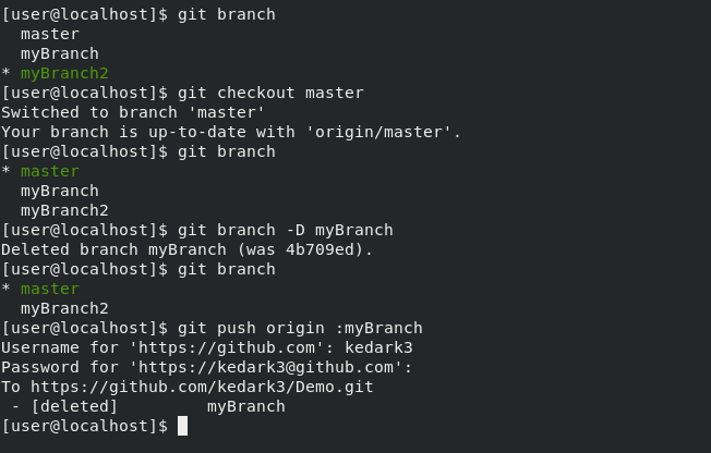 git branch 可以列出可用的分支,使用 checkout 切换到 master 分支,然后使用 git branch -D myBranch 删除该分支。再次运行 git branch 检查是否只剩下两个分支(而不是三个)。