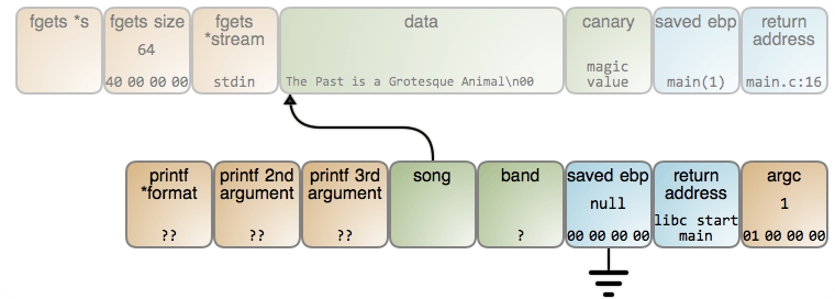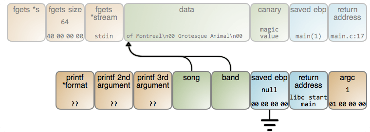 下面的图展示了这种情况下究竟发生了什么。这个图现在有一个图片映射(LCTT 译注:译文中无法包含此映射,上下两个矩形区域分别链接至输出的 #47 行和 #70 行),因此,你可以点击一个数据片断去看一下相关的 GDB 输出(GDB 命令在 这里)。只要 read() 读取了歌曲的名字,栈将是这个样子: