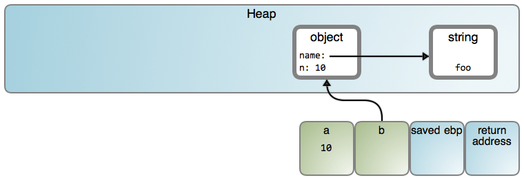 我之所以说“可能”的原因是,特定的行为高度依赖于实现。这篇文章使用的许多流程图形是以一个 V8 为中心的方法,这些图形都链接到相关的源代码。在 V8 中,仅 小整数 是 以值的方式保存。因此,从现在开始,我将在对象中直接以字符串去展示,以避免引起混乱,但是,请记住,正如上图所示的那样,它们在堆中是分开保存的。