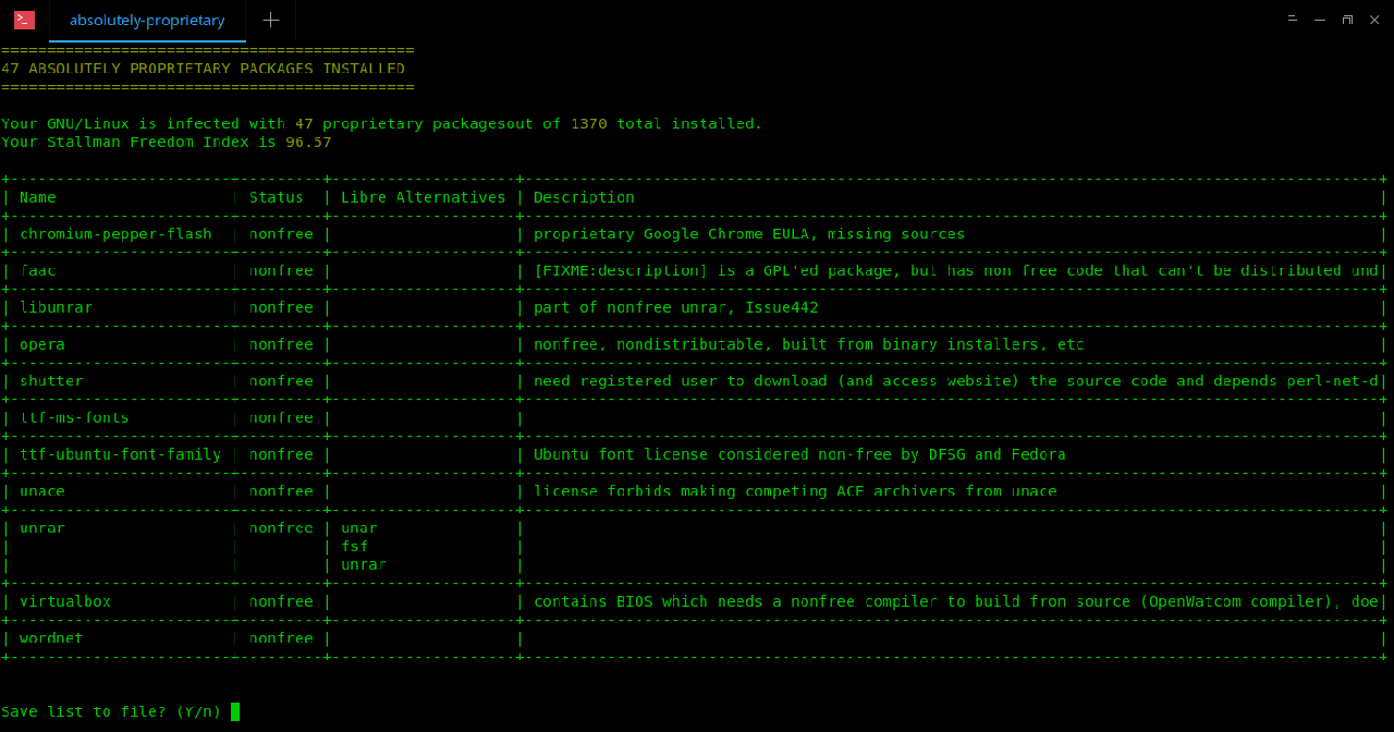 Retrieving local packages (including AUR)... Downloading https://git.parabola.nu/blacklist.git/plain/blacklist.txt Downloading https://git.parabola.nu/blacklist.git/plain/aur-blacklist.txt Comparing local packages to remote... ============================================= 47 ABSOLUTELY PROPRIETARY PACKAGES INSTALLED ============================================= Your GNU/Linux is infected with 47 proprietary packages out of 1370 total installed. Your Stallman Freedom Index is 96.57 +------------------------|---------|--------------------|---------------------------------------------------------------------------------------------+ | Name | Status | Libre Alternatives | Description | +------------------------|---------|--------------------|---------------------------------------------------------------------------------------------+ | chromium-pepper-flash | nonfree | | proprietary Google Chrome EULA, missing sources | +------------------------|---------|--------------------|---------------------------------------------------------------------------------------------+ | faac | nonfree | | [FIXME:description] is a GPL'ed package, but has non free code that can't be distributed und| +------------------------|---------|--------------------|---------------------------------------------------------------------------------------------+ | libunrar | nonfree | | part of nonfree unrar, Issue442 | +------------------------|---------|--------------------|---------------------------------------------------------------------------------------------+ | opera | nonfree | | nonfree, nondistributable, built from binary installers, etc | +------------------------|---------|--------------------|---------------------------------------------------------------------------------------------+ | shutter | nonfree | | need registered user to download (and access website) the source code and depends perl-net-d| +------------------------|---------|--------------------|---------------------------------------------------------------------------------------------+ | ttf-ms-fonts | nonfree | | | +------------------------|---------|--------------------|---------------------------------------------------------------------------------------------+ | ttf-ubuntu-font-family | nonfree | | Ubuntu font license considered non-free by DFSG and Fedora | +------------------------|---------|--------------------|---------------------------------------------------------------------------------------------+ | unace | nonfree | | license forbids making competing ACE archivers from unace | +------------------------|---------|--------------------|---------------------------------------------------------------------------------------------+ | unrar | nonfree | unar | | | | | fsf | | | | | unrar | | +------------------------|---------|--------------------|---------------------------------------------------------------------------------------------+ | virtualbox | nonfree | | contains BIOS which needs a nonfree compiler to build from source (OpenWatcom compiler), doe| +------------------------|---------|--------------------|---------------------------------------------------------------------------------------------+ | wordnet | nonfree | | | +------------------------|---------|--------------------|---------------------------------------------------------------------------------------------+ Save list to file? (Y/n)