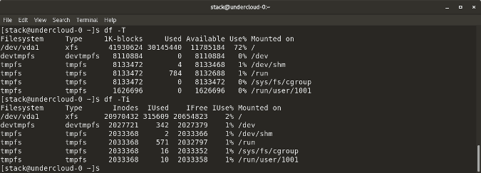 df -T 显示磁盘使用情况以及每个块的文件系统类型(例如,xfs、ext2、ext3、btrfs 等)。