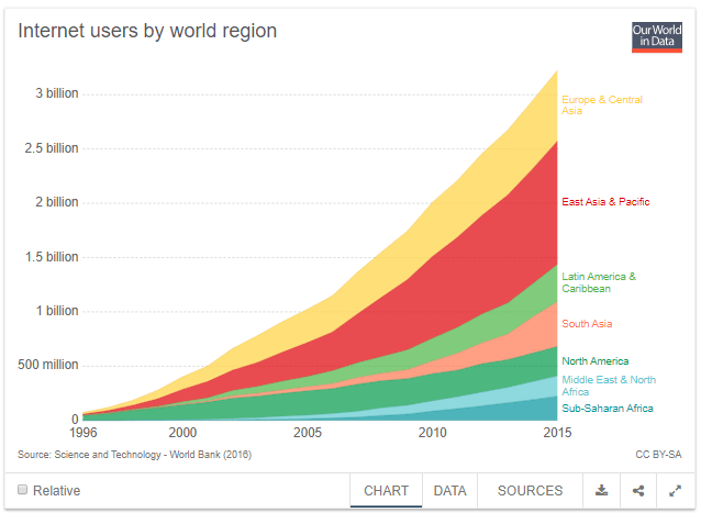 一年后,互联网拥有了 7500 万用户。到 1999 年,它已在全球范围内增长到 2.8 亿用户。
