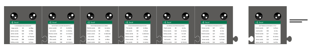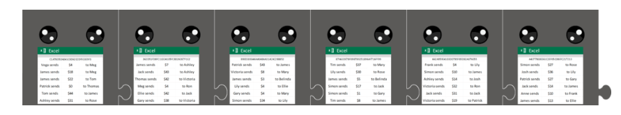 电子表格中的每一行都包含一条信息,例如交易信息,例如“Vega 向 Meg 发送 4 美元”。最终,电子表格块“完成”并链接到链中的前一个块。