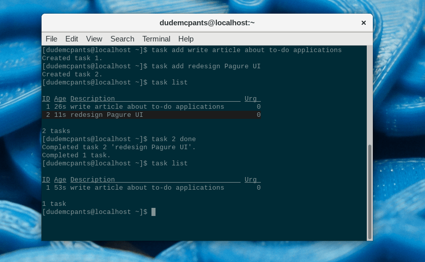Taskwarrior 是一个灵活的命令行任务管理程序。它高度可定制化,但同样“开箱即用”。使用简单的命令,你可以创建任务,标记完成,并列出当前进行中的任务。另外,任务可以被标记、添加到项目、搜索和过滤。此外,你可以设置循环任务,并设置任务截止日期。