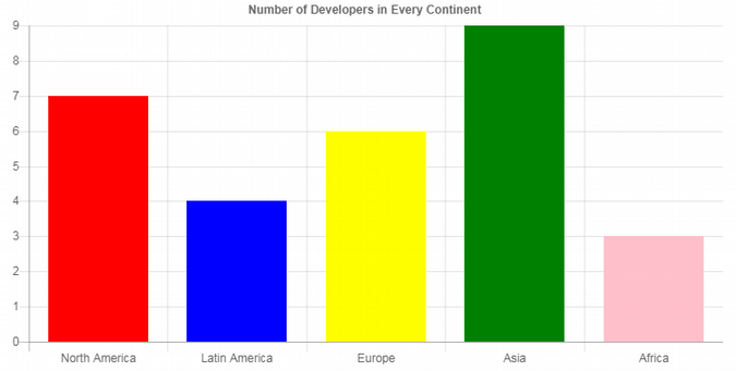 <!DOCTYPE html> <html> <head> <script src="https://cdnjs.cloudflare.com/ajax/libs/Chart.js/2.5.0/Chart.min.js"></script> </head> <body> <canvas id="bar-chart" width=300" height="150"></canvas> <script> new Chart(document.getElementById("bar-chart"), { type: 'bar', data: { labels: ["North America", "Latin America", "Europe", "Asia", "Africa"], datasets: [ { label: "Number of developers (millions)", backgroundColor: ["red", "blue","yellow","green","pink"], data: [7,4,6,9,3] } ] }, options: { legend: { display: false }, title: { display: true, text: 'Number of Developers in Every Continent' }, scales: { yAxes: [{ ticks: { beginAtZero:true } }] } } }); </script> </body> </html>