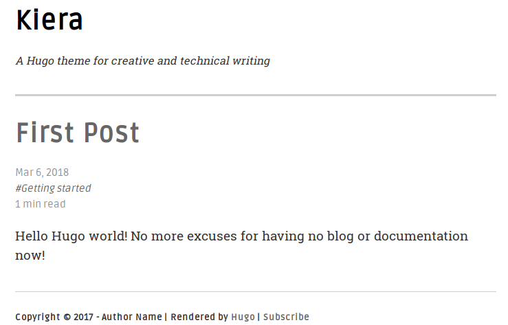 当你启动你的服务器并输入:http://localhost:1313/,你将会看到你的博客。(访问我 Gihub 主页上的 例子 )如果你想让文章的菜单栏和 Github 相似,给 themes/kiera/static/css/styles.css 打上这个 补丁。