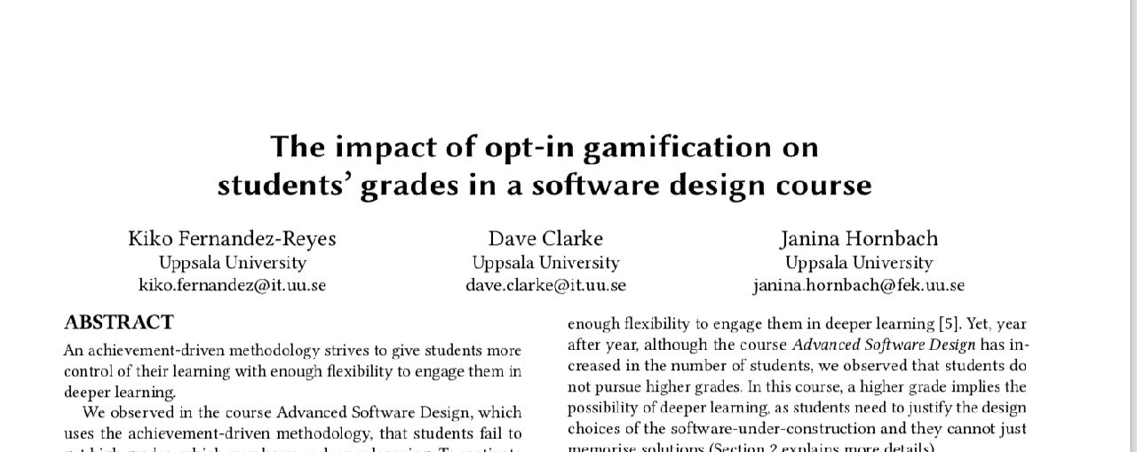 --- template: 'mytemplate.tex' documentclass: acmart classoption: sigconf title: The impact of opt-in gamification on `\\`{=latex} students' grades in a software design course author: - name: Kiko Fernandez-Reyes affiliation: Uppsala University email: kiko.fernandez@it.uu.se - name: Dave Clarke affiliation: Uppsala University email: dave.clarke@it.uu.se - name: Janina Hornbach affiliation: Uppsala University email: janina.hornbach@fek.uu.se bibliography: biblio.bib abstract: | An achievement-driven methodology strives to give students more control over their learning with enough flexibility to engage them in deeper learning. (more stuff continues) include-before: | \` ``{=latex} \copyrightyear{2018} \acmYear{2018} \setcopyright{acmlicensed} \acmConference[MODELS '18 Companion]{ACM/IEEE 21th International Conference on Model Driven Engineering Languages and Systems}{October 14--19, 2018}{Copenhagen, Denmark} \acmBooktitle{ACM/IEEE 21th International Conference on Model Driven Engineering Languages and Systems (MODELS '18 Companion), October 14--19, 2018, Copenhagen, Denmark} \acmPrice{XX.XX} \acmDOI{10.1145/3270112.3270118} \acmISBN{978-1-4503-5965-8/18/10} \begin{CCSXML} <ccs2012> <concept> <concept_id>10010405.10010489</concept_id> <concept_desc>Applied computing~Education</concept_desc> <concept_significance>500</concept_significance> </concept> </ccs2012> \end{CCSXML} \ccsdesc[500]{Applied computing~Education} \keywords{gamification, education, software design, UML} \` `` figPrefix: - "Fig." - "Figs." secPrefix: - "Section" - "Sections" ...