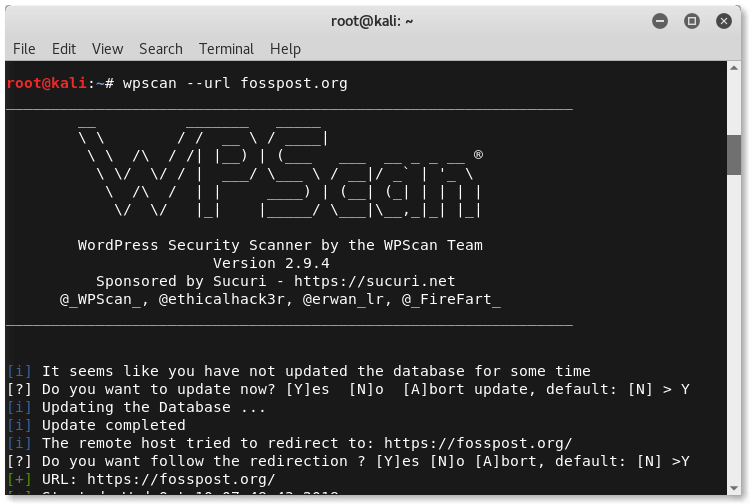 使用 Kali Linux 在 fosspost.org 上运行 wpscan