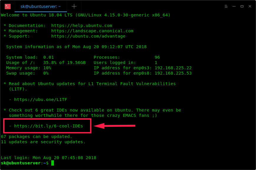 正如你在上面截图中所看到的,欢迎消息中有一个 bit.ly 链接和 Ubuntu wiki 链接。有些人可能会惊讶并想知道这是什么。其实欢迎信息中的链接无需担心。它可能看起来像广告,但并不是商业广告。链接实际上指向到了 Ubuntu 官方博客 和 Ubuntu wiki。正如我之前所说,其中的一个链接是不相关的,没有任何与 Ubuntu 服务器相关的细节,这就是为什么我开头称它们为广告。