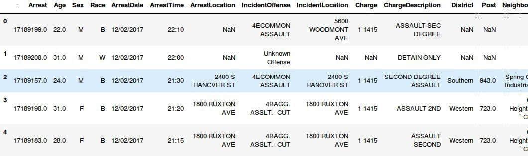 作为快速演示,让我们启动 Python shell 并在 pandas DataFrame 变量中加载来自巴尔的摩的犯罪统计数据的开放数据集,并查看加载的一部分 DataFrame:
