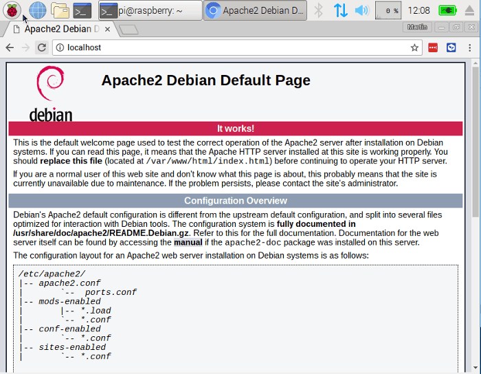 Apache 默认放了一个测试文件在一个 web 目录中,你可以从你的电脑或是你网络中的其他计算机进行访问。只需要打开 web 浏览器,然后输入地址 <http://localhost>。或者(特别是你使用的是 Raspbian Lite 的话)输入你的树莓派的 IP 地址代替 localhost。你应该会在你的浏览器窗口中看到这样的内容: