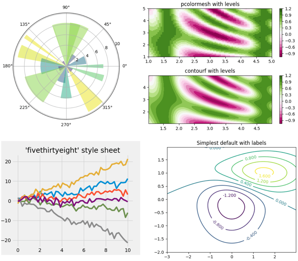 Matplotlib 是应用最广泛的 2D Python 可视化库。它包含海量的命令和接口,可以让你根据数据生成高质量的图表。要学习使用 Matplotlib,可以参考这篇详尽的文章。