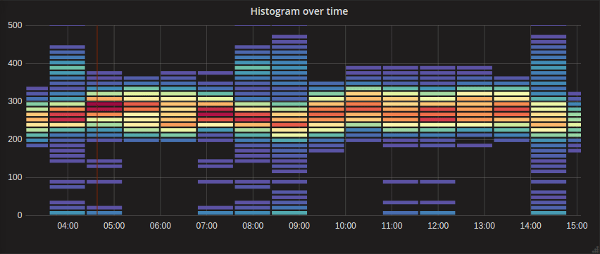 另一种常见的可视化方式是热力图。热力图与条形图比较类似,还可以在条形图的基础上显示某部分在整体中占比的变化情况。例如在查看网络请求延时的时候,就可以使用热力图快速查看到所有网络请求的总体趋势和分布情况,另外,它可以使用不同颜色来表示不同部分的数值。