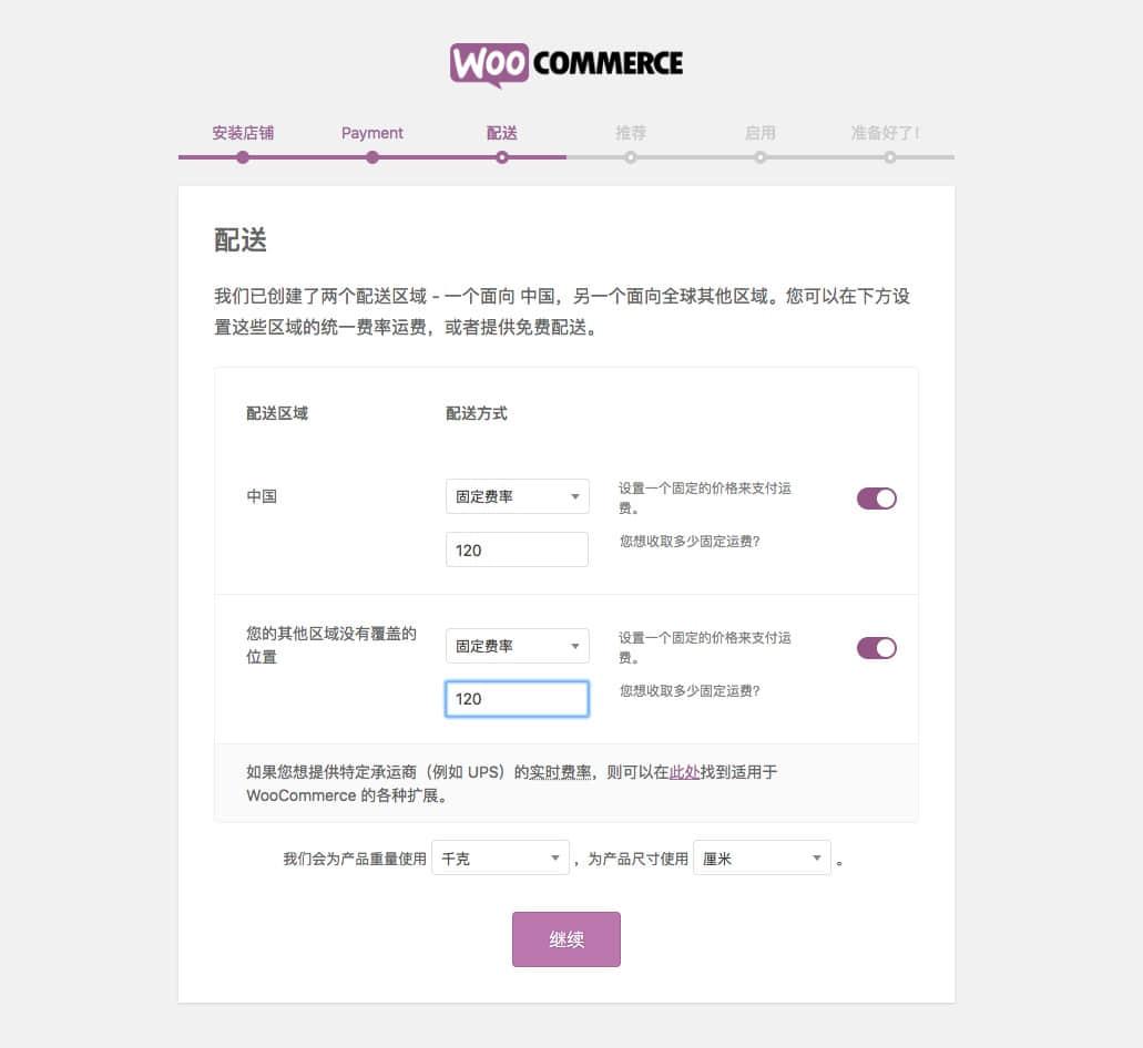 启用插件后, WooCommerce 会引导你进行初始化配置,根据提示对插件进行配置。