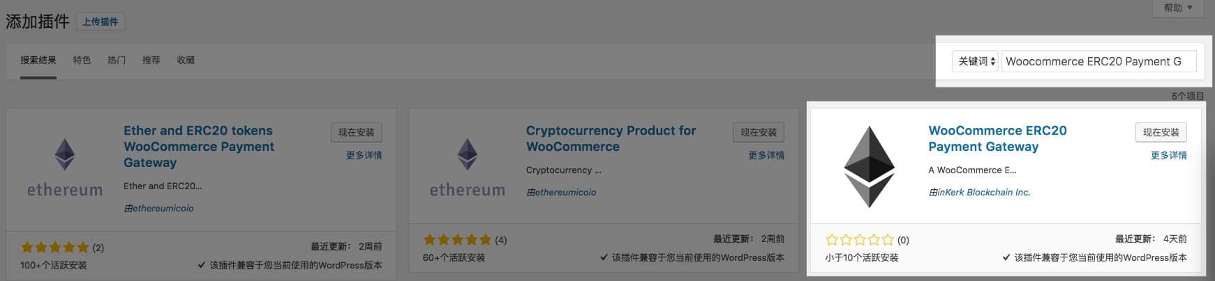打开“插件”-“安装插件”,在关键词中输入 “Woocommerce Customize ERC20 Currency”并回车。这是我们联合硬核区块链公司开发的一款用于给 WooCommerce 增加 ERC20 货币的插件,该插件已经开源于 GitHub。