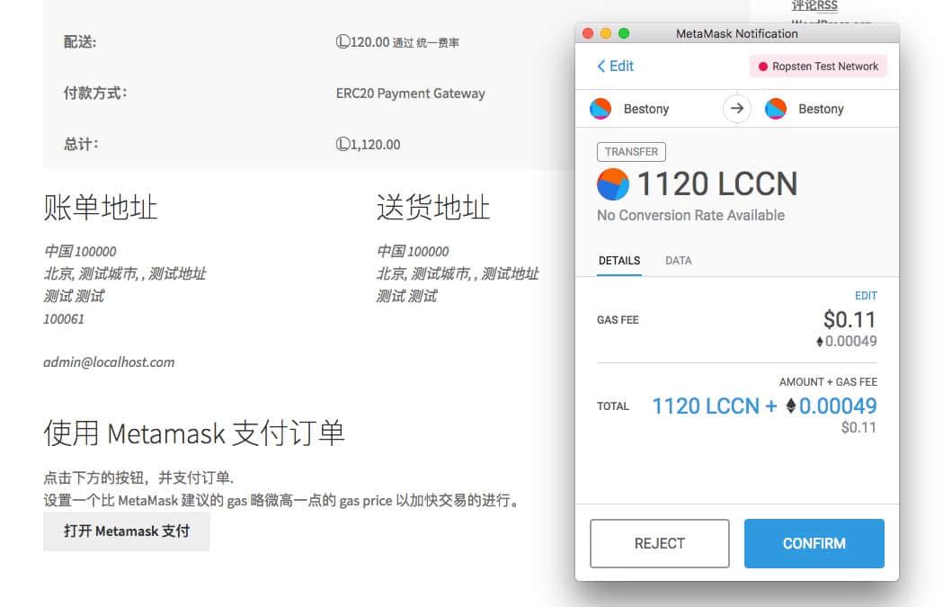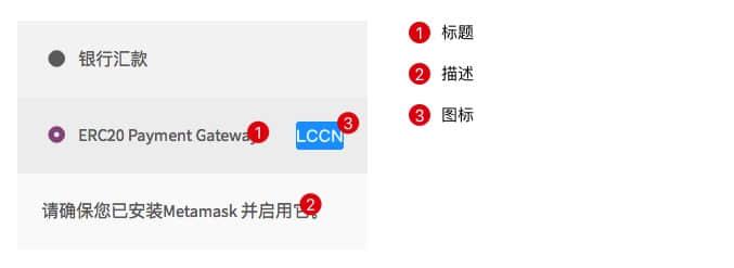 描述会展示在支付方式的下方,同样的,你可以设置为 “使用 LCCN 支付费用”,此外,还建议你在此引导顾客安装、并打开 Metask 插件,切换到主网络,确保后续支付。