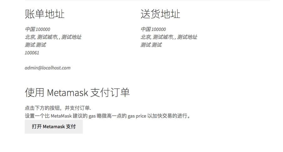 在结算页面,拖动到底部,可以看到支付按钮,点击支付按钮,会自动唤起浏览器的 Metamask 插件。