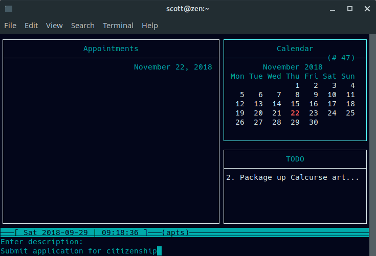 按键盘上的 Tab 键在面板之间移动。要在面板添加新项目,请按下 a。Calcurse 将指导你完成添加项目所需的操作。
