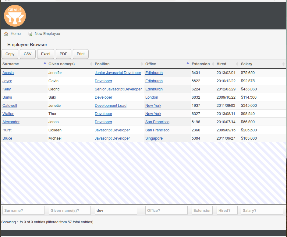 var table = $('#employee_dt').DataTable( { "scrollY": 500, "deferRender": true, "scroller": true, "dom": "Brtip", "buttons": [ 'copy', 'csv', 'excel', 'pdf', 'print' ], "processing": true, "serverSide": true, "ajax": { "url": "${createLink(controller: 'employee', action: 'browserLister')}", "type": "POST", }, "columns": [ { "data": "surname" }, { "data": "givenNames" }, { "data": "position" }, { "data": "office" }, { "data": "extension" }, { "data": "hired" }, { "data": "salary" } ] });