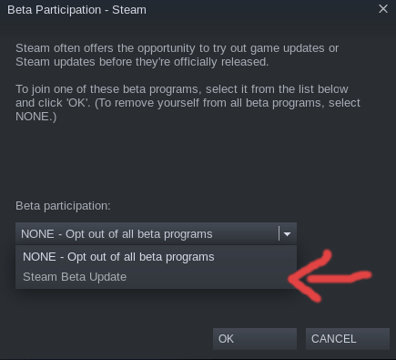 现在将 “None” 更改为 “Steam Beta Update”。