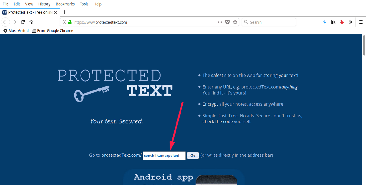 访问 https://www.protectedtext.com/ 这个链接,就可以打开 ProtectedText 页面了(LCTT 译注:如果访问不了,你知道的)。这个时候你将进入网站主页,接下来需要在页面上的输入框输入一个你想用的名称,或者在地址栏后面直接加上想用的名称。这个名称是一个自定义的名称(例如 https://www.protectedtext.com/mysite),是你查看自己保存的笔记的专有入口。