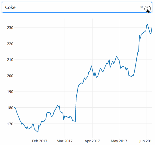 下面的示例显示了一个具有下拉功能的高度交互的图表。当用户在下拉列表中选择一个值时,应用程序代码将数据从 Google Finance 动态导出到 Pandas 数据框架中。
