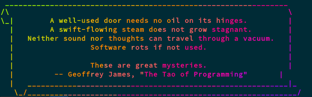你可以传递给 lolcat 一些参数。这里不再赘述,我建议你访问 lolcat 的 GitHub 页面 或者在终端输入 lolcat --help 了解。但一般来说,它们能设置彩虹的传递和频率,以及我个人最喜欢的动画。谁不喜欢终端的彩色动画输出呢?让我们再试一次,用一个不同的边框(当然是以猫为主题)和一句在我的格言列表中的适合猫的句子。