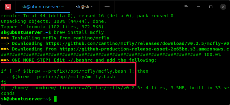 ==> Installing mcfly from cantino/mcfly ==> Downloading https://github.com/cantino/mcfly/releases/download/v0.2.5/mcfly-v0 ==> Downloading from https://github-production-release-asset-2e65be.s3.amazonaws.c ######################################################################## 100.0% ==> ONE MORE STEP! Edit ~/.bashrc and add the following: if [ -f $(brew --prefix)/opt/mcfly/mcfly.bash ]; then . $(brew --prefix)/opt/mcfly/mcfly.bash fi /home/linuxbrew/.linuxbrew/Cellar/mcfly/v0.2.5: 4 files, 3.5MB, built in 33 seconds