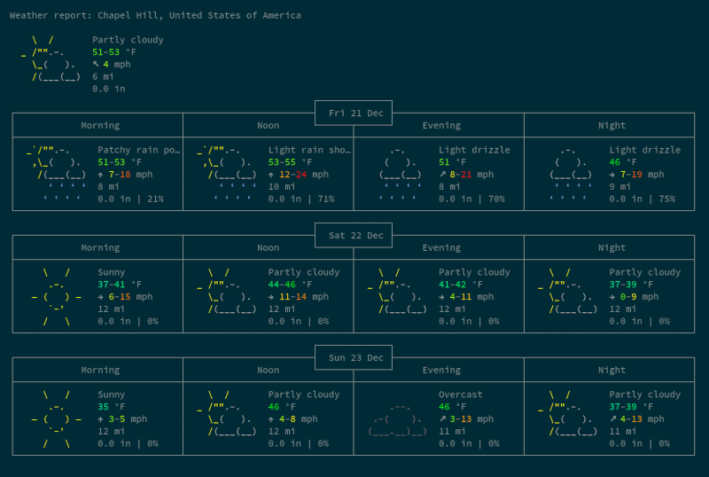 接下来,Opensource.com 的撰稿人 Manuel Dewald 提出了一种从终端获取当地天气的方法。它很简单,你只需安装 curl(或者,wget)。