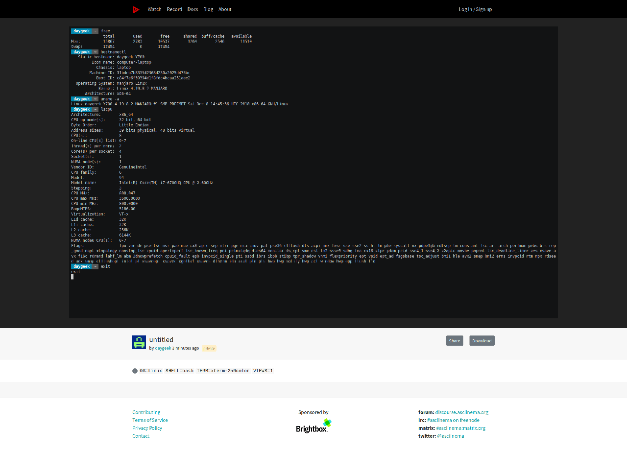 如果你完成了,简单的按下 CTRL+D 或输入 exit 来停止录制,然后按下回车来上传文件到 asciinema.org 网站。