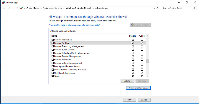 在打开的窗口中,在“允许的应用和特性”下找到“远程桌面”。根据你用来访问这个桌面的网络酌情勾选“隐私”和/或“公开”列的选框。点击“确定”。