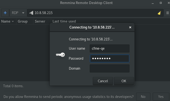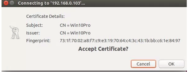回到你用来远程访问 Windows 主机的 Linux 电脑,打开 Remmina。输入你的 Windows 主机的 IP 地址,敲击回车键。(我怎么在 Linux 和 Windws 中确定我的 IP 地址?)看到提示后,输入你的用户名和密码,点击“确定”。