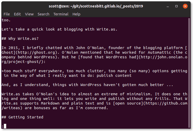 less 的美妙之处在于它易于使用,它将你正在查看的文件分解为块(或页面),这使得它们更易于阅读。你可以使用它在命令行查看文本文件,例如 README、HTML 文件、LaTeX 文件或其他任何纯文本文件。我在上一篇文章中介绍了 less。