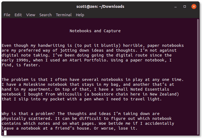 与 Antiword 一样,odt2txt 将文档转换为文本并在终端窗口中显示。和 Antiword 一样,它不会对文档进行分页。但是,你也可以使用以下命令将 odt2txt 的输出管道传输到 less 或 more 这样的实用程序中: