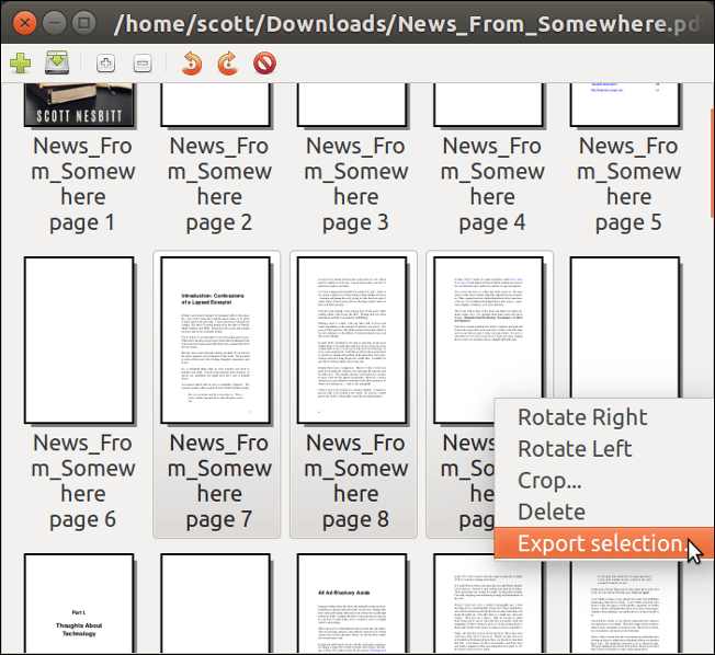 要提取第 7 页到第 9 页,请按住 Ctrl 并单击选择页面。然后,右键单击并选择 “Export selection”。