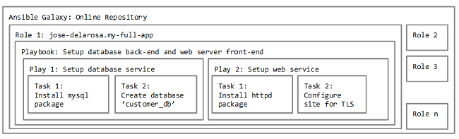 请注意上面的例子只是组织任务的方式之一,我们当然也可以把安装数据库和安装 web 服务器的剧本拆开,放到不同的角色里。Ansible 星系上最常见的角色是独立安装、配置每个应用服务,你可以参考这些安装 mysql 和 httpd 的例子。