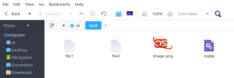 为了达到指导目的,我建了两个文件 file1 和 file2。我同时也有 toplip 可执行二进制文件。我把它们全都保存进一个叫做 test 的目录。