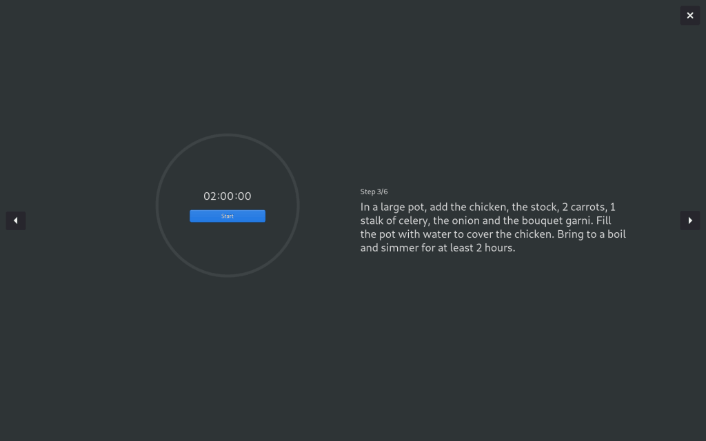 GNOME Recipes 中一个非常棒的小功能是分步全屏模式。当你准备做饭时,只需激活此模式,将笔记本电脑拿到厨房,你就可以全屏显示烹饪方法中的当前步骤。此外,当食物在烤箱中时,你可以在这个模式下设置定时器。