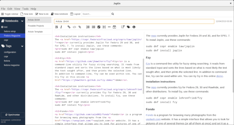 COPR 仓库目前为 Fedora 29 和 30 以及 EPEL 7 提供 Joplin。要安装 Joplin,请带上 sudo 使用这些命令: