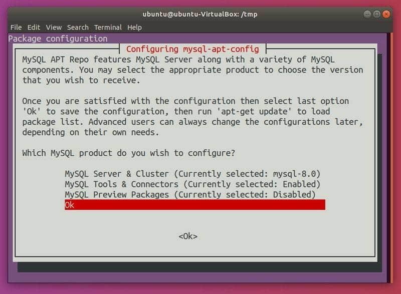 https://dev.mysql.com/get/mysql-apt-config_0.8.12-1_all.deb 是我刚刚从网页上复制的链接。根据当前的 MySQL 版本,它有可能不同。让我们使用 dpkg 去开始安装 MySQL:
