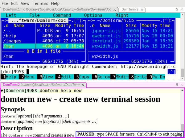 富文本输出: 有着 HTML 样式的帮助信息更加便于阅读,看上去也更漂亮。图片 1 的下面面板展示 dormterm help 的输出。(如果没在 DomTerm 下运行的话输出的是普通文本。)注意自带的分页器中的 PAUSED 消息。