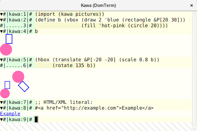 Kawa 语言有一个创建并转换几何图像值的库。如果你将这样的图片值打印到 DomTerm 终端,图片就会被转换成 SVG 形式并嵌入进输出中。