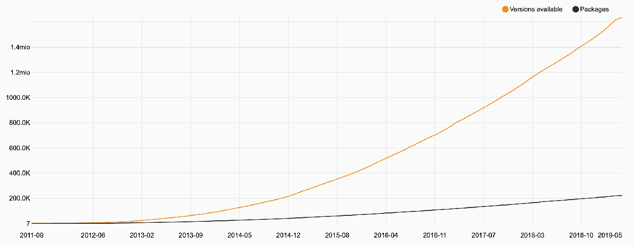 请查看此图表,它列出一段时间内的软件包和版本数量变化。它也可以在 Packagist 网站上找到它。