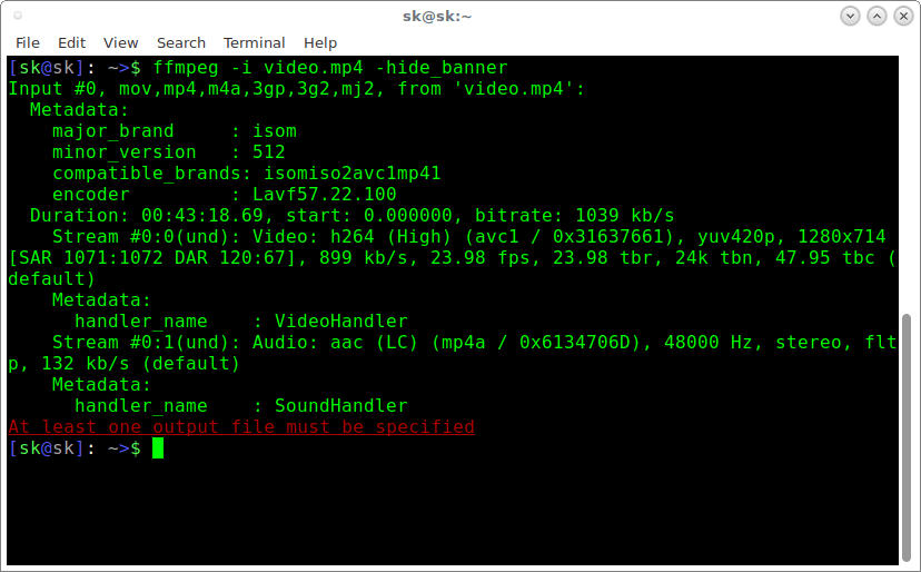 如果你不想看 FFmpeg 标语和其它细节,而仅仅想看媒体文件信息,使用 -hide_banner 标志,像下面。