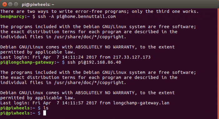 使树莓派安全后,让它在线,你将可以在世界的任何地方登录你的网络。一旦你登录到你的树莓派,你可以用 SSH 访问本地网络上的局域网地址(例如,192.168.1.31)访问其他设备。如果你在这些设备上有密码,用密码就好了。如果它们同样只允许 SSH 密匙,你需要确保你的密匙通过 SSH 转发,使用 -A 参数:ssh -A pi@123.45.67.89。