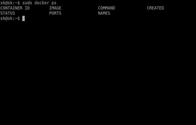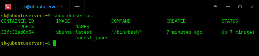 CONTAINER ID IMAGE COMMAND CREATED STATUS PORTS NAMES 32fc32ad0d54 ubuntu:latest "/bin/bash" 7 minutes ago Up 7 minutes modest_jones