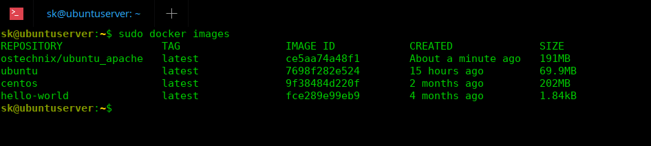 REPOSITORY TAG IMAGE ID CREATED SIZE ostechnix/ubuntu_apache latest ce5aa74a48f1 About a minute ago 191MB ubuntu latest 7698f282e524 15 hours ago 69.9MB centos latest 9f38484d220f 2 months ago 202MB hello-world latest fce289e99eb9 4 months ago 1.84kB