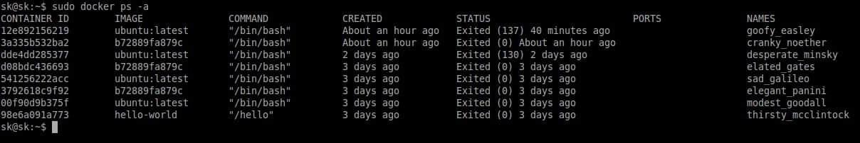 CONTAINER ID IMAGE COMMAND CREATED STATUS PORTS NAMES 3d24b3de0bfc ubuntu:latest "/bin/bash" 28 minutes ago Up 28 minutes goofy_easley