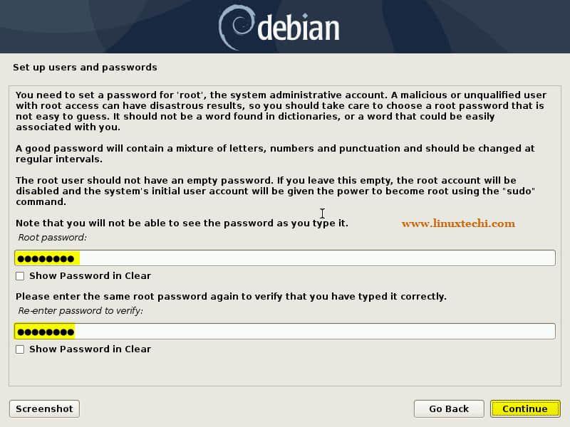 在下面的屏幕中指定 root 密码,然后在 “Continue” 上单击。