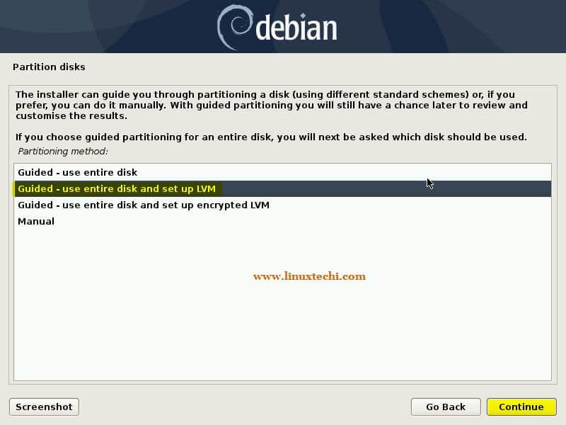 在这个步骤中,为 Debian 10 选择硬盘分区方案,就我而言,我有 40 GB 硬盘可用于操作系统安装。分区方案有两种类型: